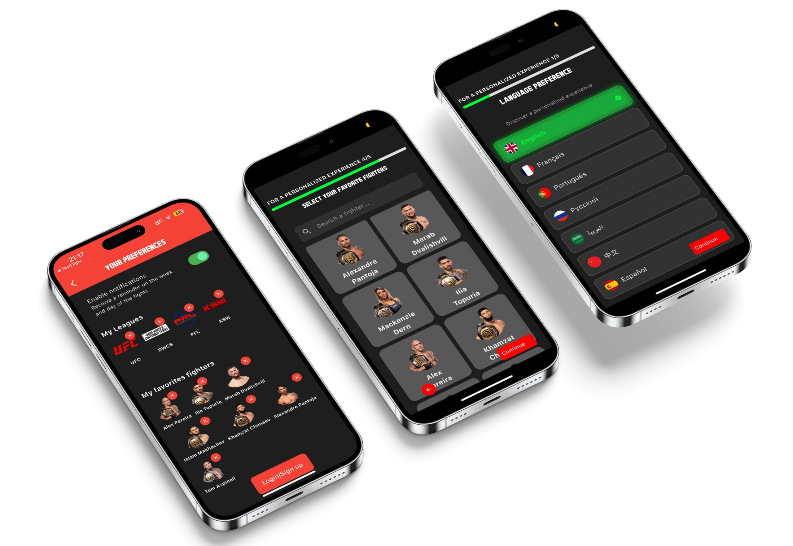 Choose your favorite language, MMA fighters, boxing champions, and combat sports leagues to personalize your experience. Get faster access to the latest fight news, live results, rankings, and exclusive content from the fighters and organizations you follow most.
